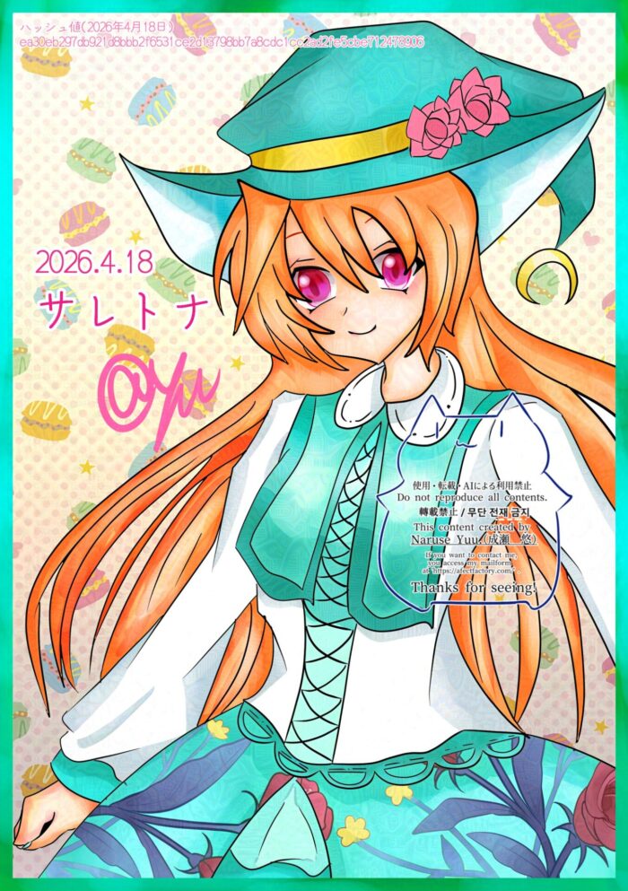 ようやく更新できました。四月のトップ絵はサレトナちゃんです。
